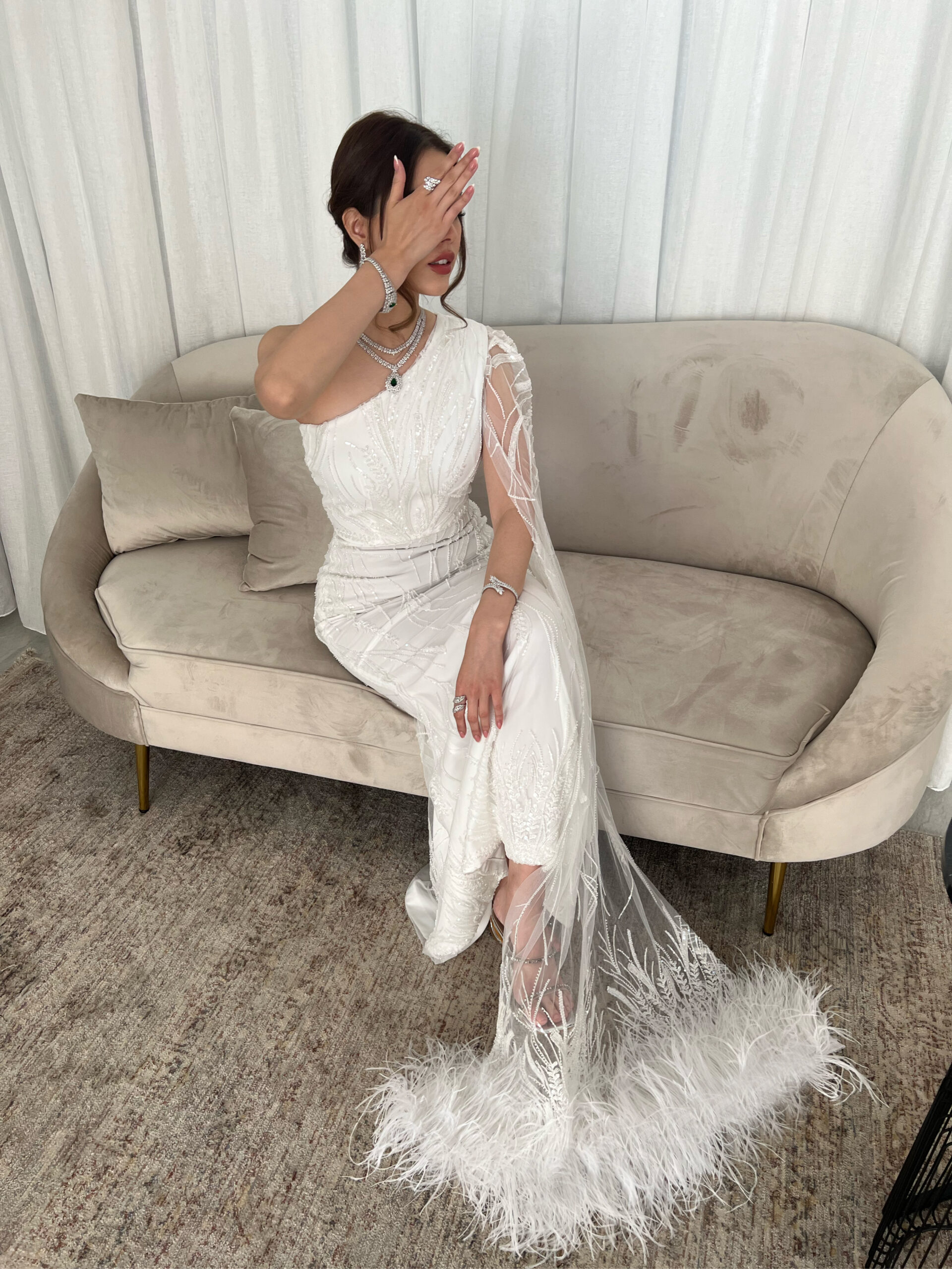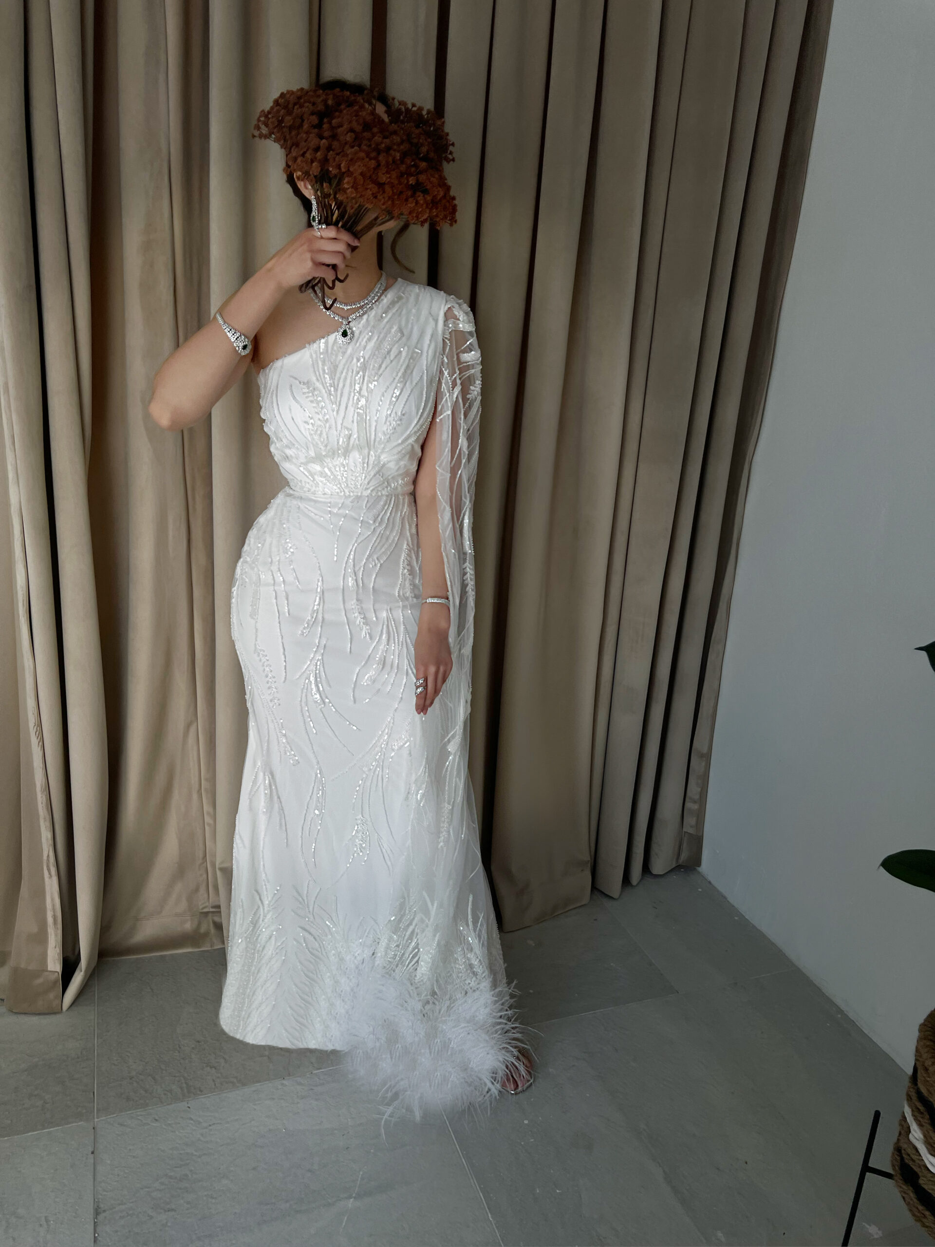 فستان ابيض فخم مشكوك ومطرز بلكامل مع ريش